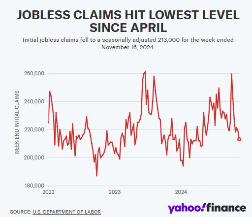 根据美国劳工部周四(11月21日)公布的数据显示,截至11月16日当周,美国首次申请失业救济的人数减少6,000人至213,000人,低于分析师预测的220,000人。