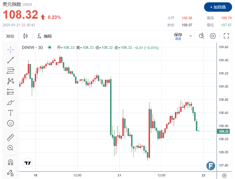 截至发稿,周二美元指数(DXY)上涨 0.23%,至 108.32,部分收复周一 1.2% 的跌幅,这是自2023年11月以来的最大单日跌幅。
