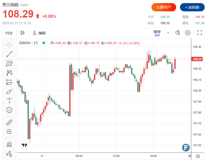 美元指数DXY短线小幅上扬后回落,现报108.29。