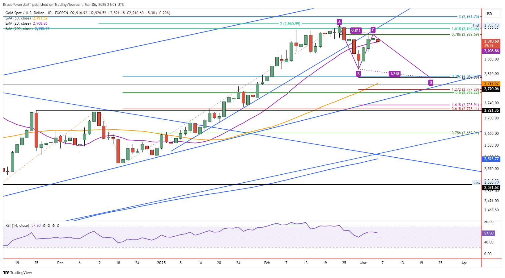 本周完成了78.6%的回撤,随后出现了为期一天的看跌反转信号。这增加了黄金在回调之前至少再下跌一轮的可能性。到目前为止,黄金只下跌了一轮,收于2833美元。尽管此前作为动态支撑的20日线在上周四被突破,但此前另一项趋势指标——上升趋势线——被突破。
