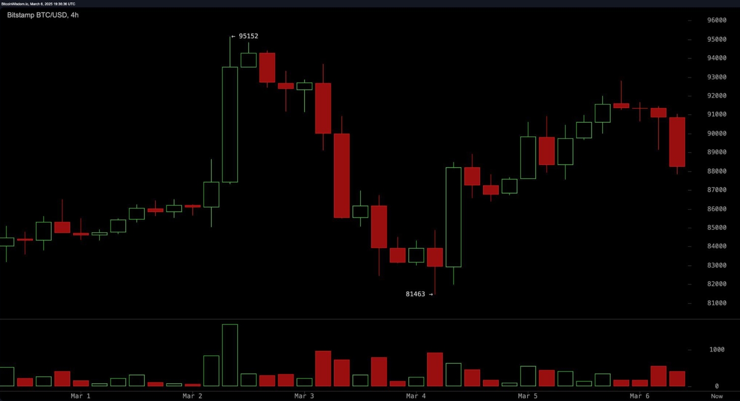 比特币4小时图显示出波动模式:急剧上涨至95152美元,回撤至81463美元,随后反弹。即时支撑位在87000美元,阻力位在92000-95000美元。下跌期间的大量成交量转变为绿色蜡烛的累积,表明看涨确认在88000-89000美元以上。在91500-92500美元处受挫可能会引发空头头寸。