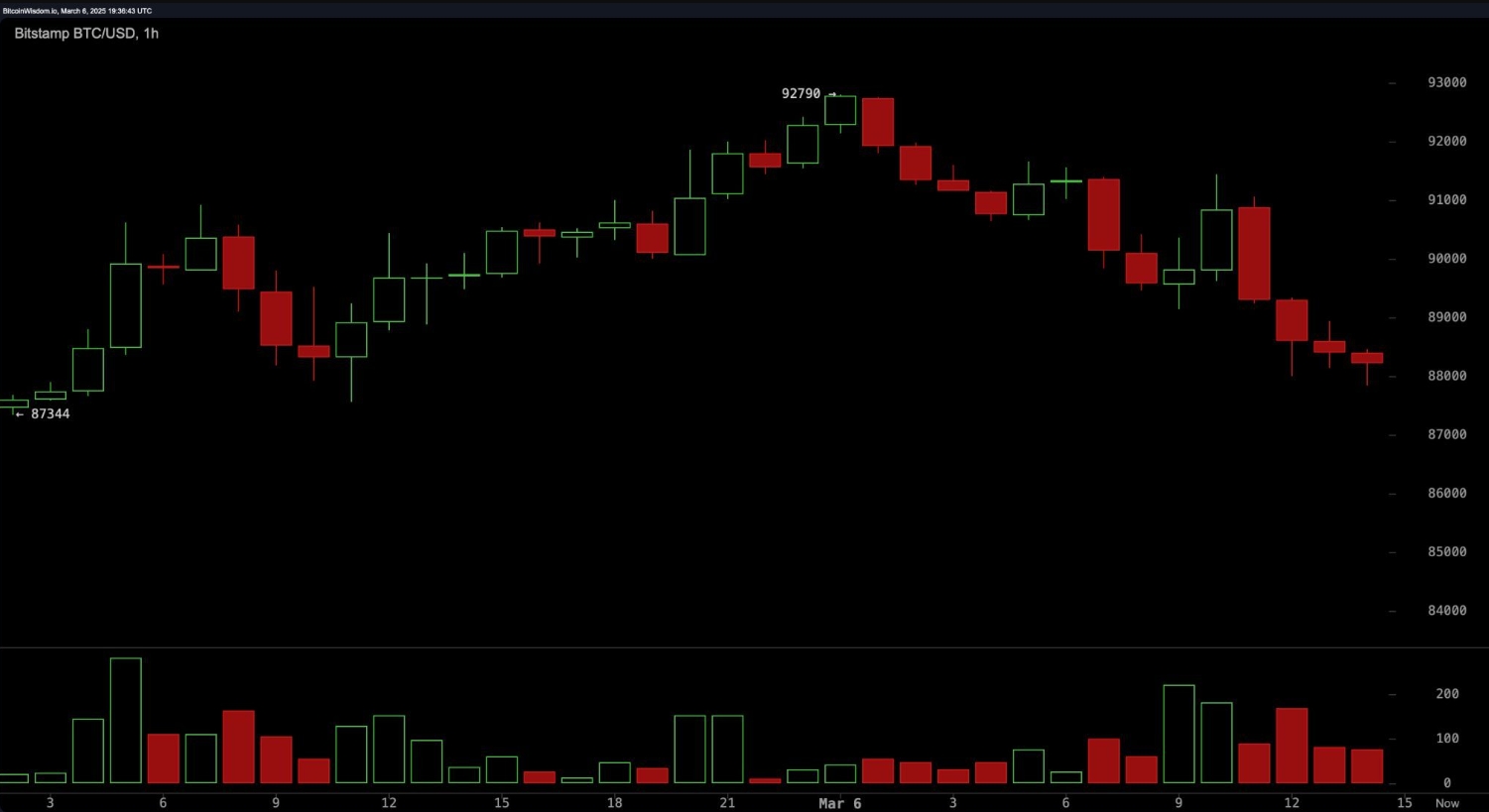 1小时图上,比特币短期趋势显示从92790美元回调,支撑位在87300-88000美元,阻力位在90000-91000美元。成交量下降暗示卖家疲软,如果比特币在88000美元附近形成看涨结构,则可能提供买入机会。然而,跌破87000美元可能会加速下行势头。