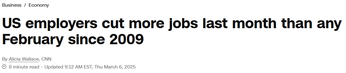 Challenger, Gray & Christmas职介和高管培训公司高级副总裁安德鲁·查林杰(Andrew Challenger)在声明中表示:“受政府效率部行动的影响,以及政府合同取消、贸易战担忧和破产等因素,2月份裁员数量大幅增加。”