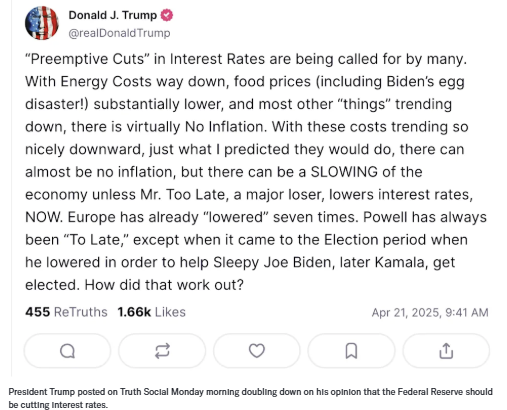 周一(4月21日)上午,特朗普在Truth Social上再次发文讽刺鲍威尔为“行动永远太晚的大输家”,并称:“如果他不立刻降息,经济就会开始放缓。”