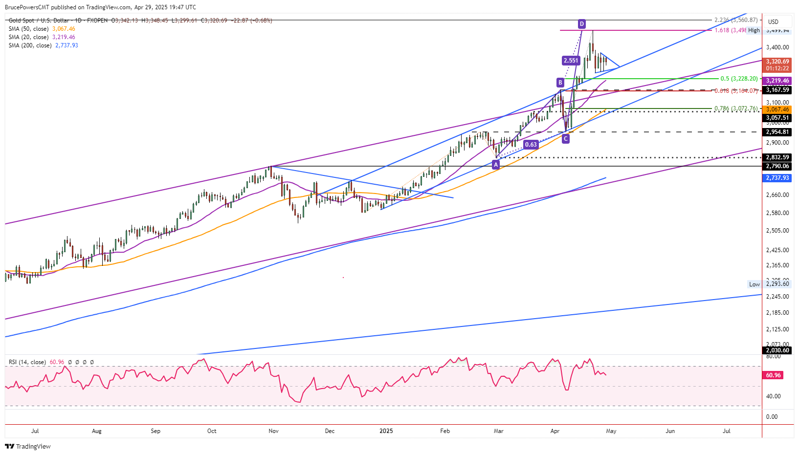 FXEmpire分析师Bruce Powers表示,金价周二再次盘整,交投于周一以来的价格区间内,并维持在上周三以来的区间内。周三,金价创下3500美元的历史新高,随后卖方重新掌控局面,形成流星K线形态,并在第二天触发下行走势。此后,围绕顶部上升趋势通道线的支撑位,形成了一个小的三角旗形盘整形态。上周三的价格区间为3260至3387美元。