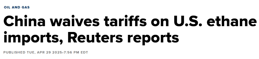 美国CNBC引述两位知情人士周二表示,中国已免除本月初对美国进口乙烷征收的125%关税,乙烷是获得豁免的产品之一。