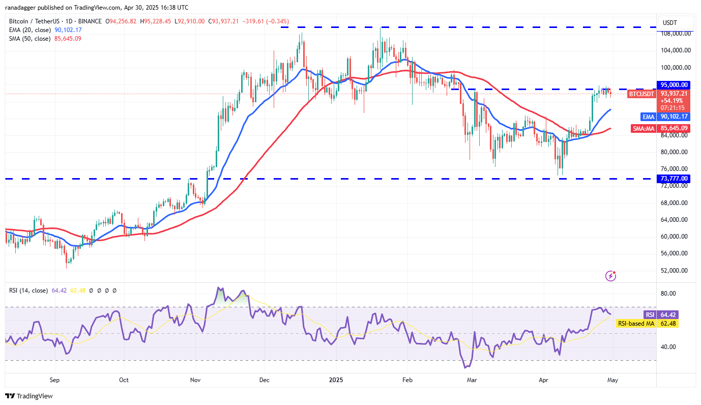 20天指数移动平均线90102美元呈上坡趋势,相对强弱指数(RSI)位于正值区域,表明阻力最小的路径是向上。突破并收于95000美元上方,可能迅速推动比特币触及100000美元的心理阻力位。