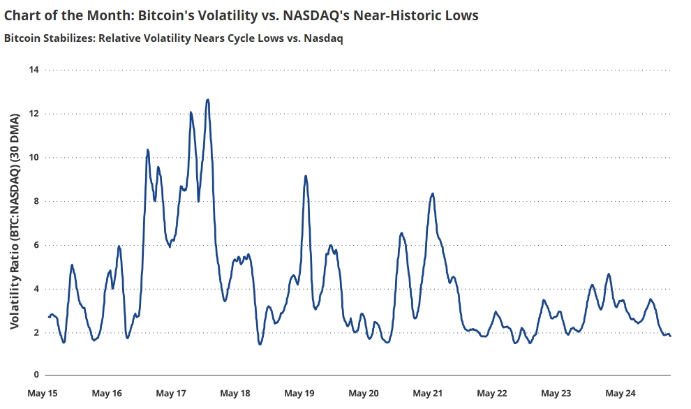 波动率指标表明市场结构正在发生更广泛的演变。实际波动率较2022年的峰值已压缩约50%,比特币与纳斯达克指数之间的波动率差目前已接近周期低点。