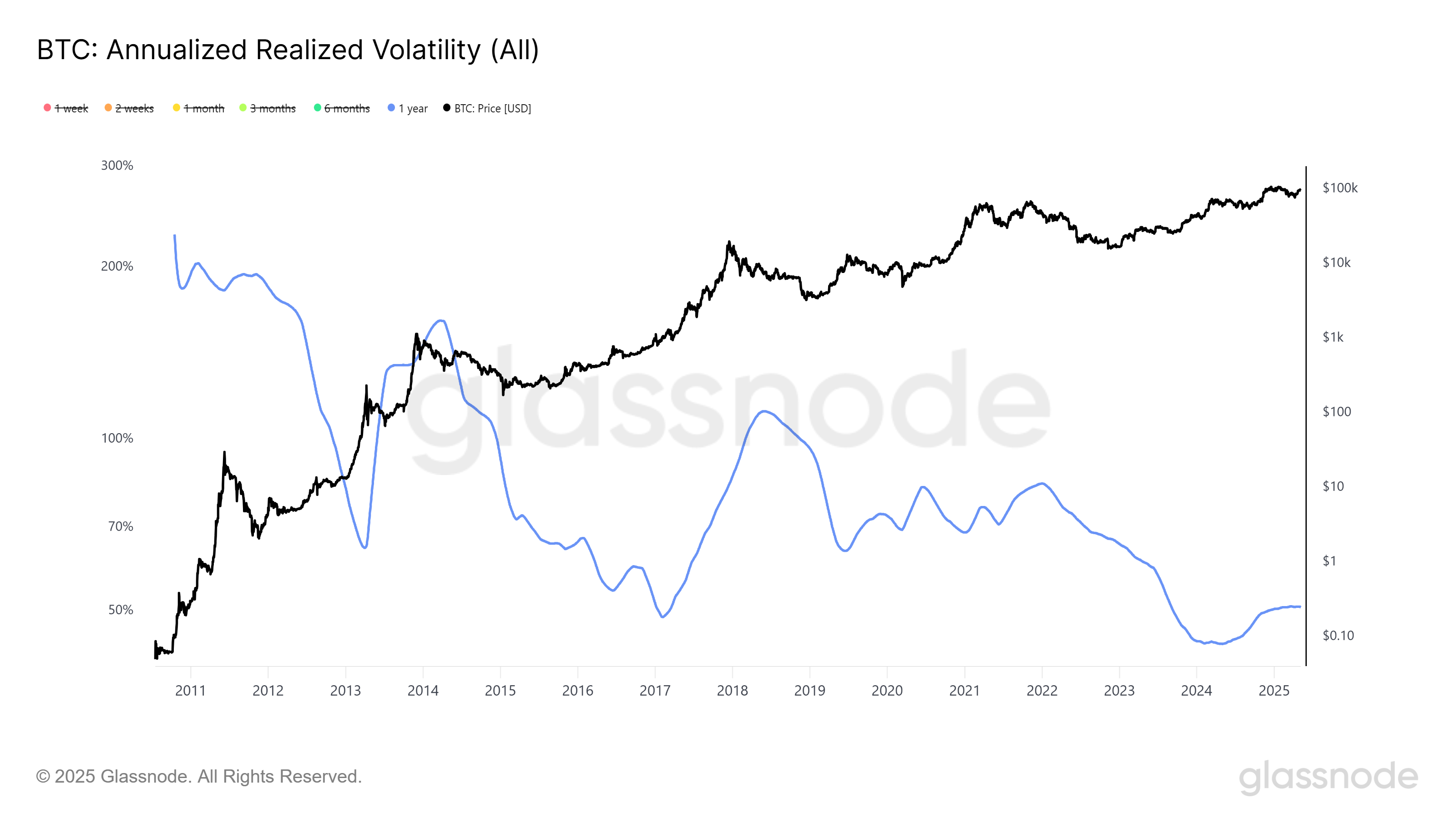 富达数字资产公司(Fidelity Digital Assets)数据显示,比特币的波动性已下降至股票指数的三到四倍,低于早期的三位数波动率,如下图所示。2019年至2025年期间,1年期年化实际波动率下降了80%以上。