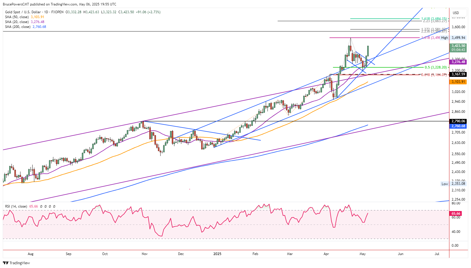 继4月7日触及2956美元的波动低点后,金价出现了相对大幅上涨。随后,金价在10天内上涨了557美元,涨幅达19%。尽管在牛市旗形触发后,金价可能无法再出现类似的涨幅,但这确实表明,随着回调盘整阶段的结束,金价有可能大幅上涨。这使得突破3500美元关口的风险很高。