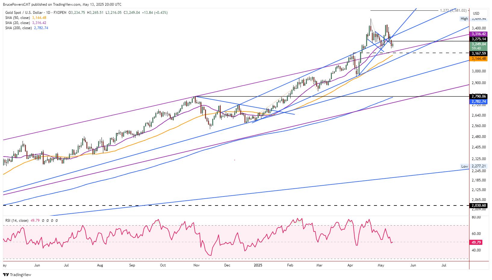 也存在未能突破牛市通道的可能。如果疲软持续,50日均线(目前为3144美元)将成为下行目标。这条线在4月份的低点成功测试,预计还会再次测试。需要反弹至20日均线上方,随后日收盘价高于该均线,才能开始将市场情绪转向牛市。