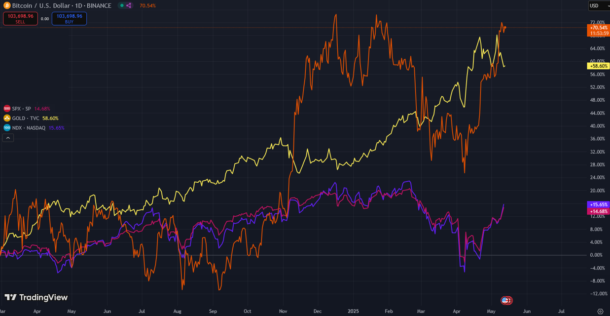 这种分化在较短的时间段内持续存在。自5月12日以来,受中美贸易关系利好推动,美国主要股指上涨3%至4%,但比特币却几乎没有波动。与此同时,黄金价格开始创下新低——分析师Michael Van de Poppe指出,这可能是下行趋势的早期信号。如果黄金进入回调阶段,比特币可能会步其后尘。 季节性因素也可能起到一定作用。