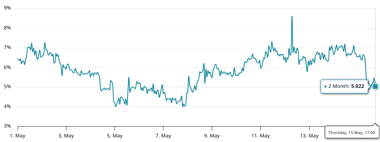 5月14日,比特币期货年化溢价达到7%的峰值,但随后回落至5%,接近中性至看跌的门槛,与四周前比特币交易价格约为84500美元时的水平相当。