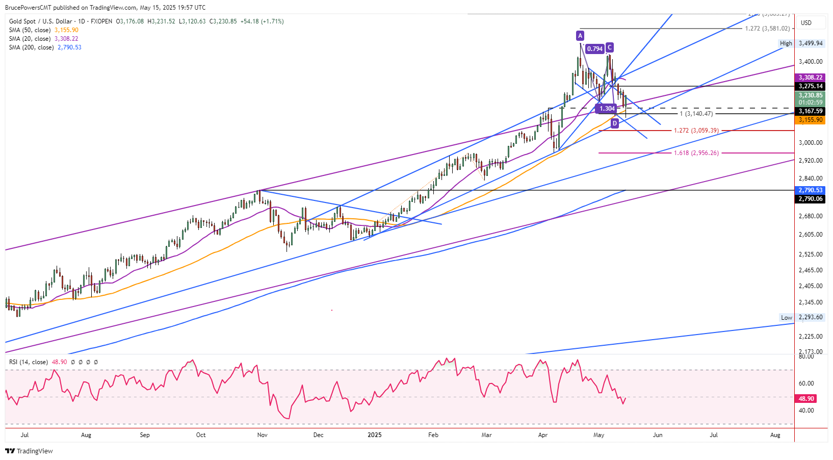一旦趋势的动态支撑位成功测试为支撑位,并随后出现看涨信号,则牛市趋势有可能持续下去。但今天的下跌具有额外的意义,因为标准的下跌ABCD形态在当日低点附近完成。总体而言,从上周高点3439美元到本周低点3121美元,两周内可能出现震荡走势。