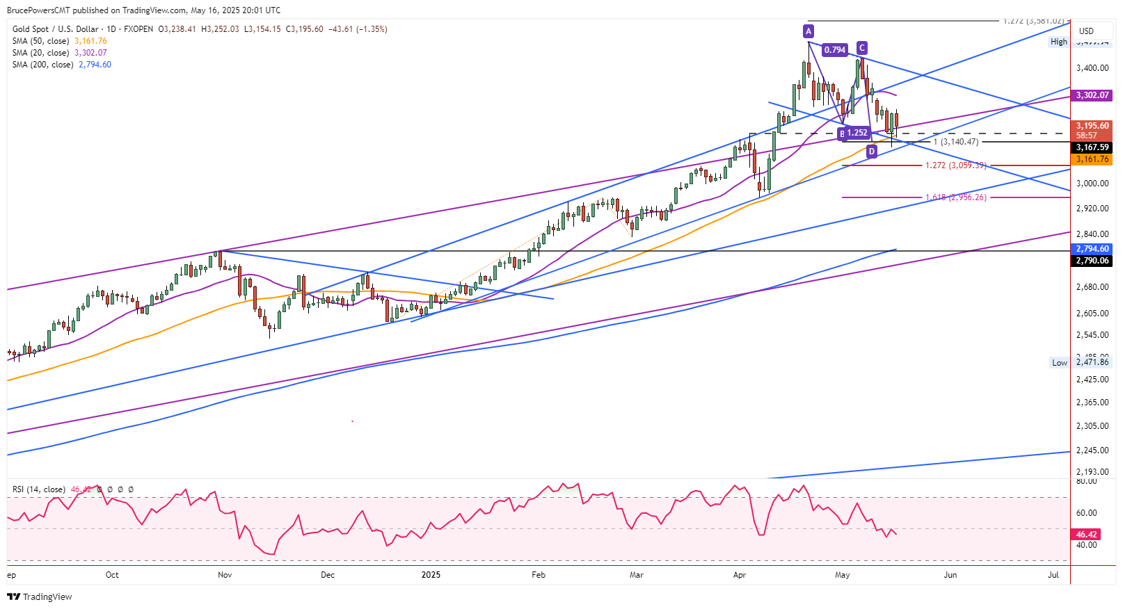 本周低点附近的价格区域由多项指标标记,表明该区域可能具有一定意义。上升趋势通道的底线接近低点,并与较短下降通道的下线重合。此外,支撑位在50日均线附近成功测试,目前为3162美元。此外,下行ABCD形态在3140美元附近达到了100%目标位。由于较低的上升趋势线和50日均线标志着上升趋势的动态支撑,因此从这些价格区域出现的看涨反转表明趋势仍然完好,并且可以预期将继续下去,除非出现看跌反转迹象。