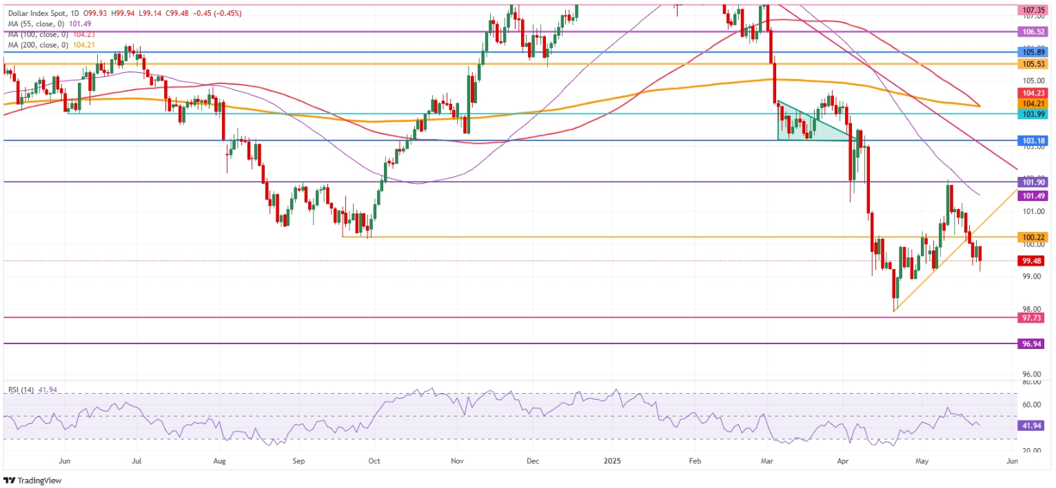 进一步下跌,相对较弱的技术支撑位位于96.94,之后将看向这一新价格区间的较低水平。这两个水平分别为95.25和94.56,这意味着将创下2022年以来的新低。