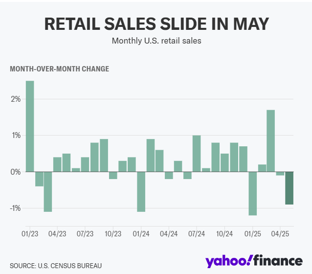 整体零售销售环比下降0.9%,远超经济学家普遍预期的0.6%跌幅。相比之下,根据美国人口普查局修正后的数据,4月销售仅下降0.1%。