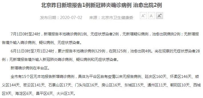 FX168财经报社(香港)讯 根据北京市卫健委最新通报,7月1日0时至24时,北京新增报告本地确诊病例1例、无症状感染者2例,无新增疑似病例,治愈出院病例2例;无新增报告境外输入确诊病例、疑似病例、无症状感染者。