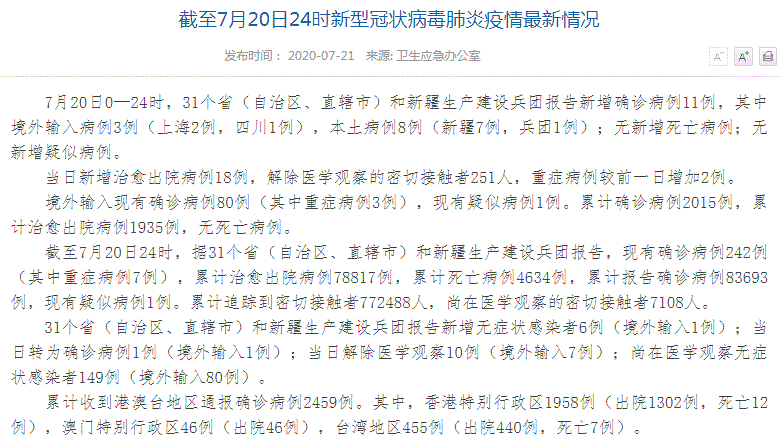 FX168财经报社(香港)讯 根据国家卫健委最新通报,7月20日0—24时,31个省(自治区、直辖市)和新疆生产建设兵团报告新增确诊病例11例,其中境外输入病例3例(上海2例,四川1例),本土病例8例(新疆7例,兵团1例);无新增死亡病例;无新增疑似病例。
