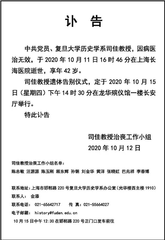 FX168财经报社(香港)讯 10月13日,复旦大学历史学系微信公号发布悼念司佳老师的消息。复旦大学历史学系教授司佳女士,因病医治无效,于2020年10月11日16时46分在上海长海医院逝世,享年42岁。