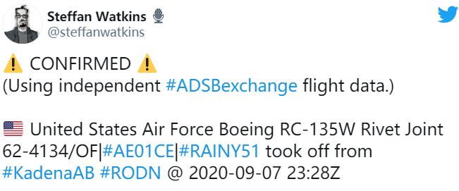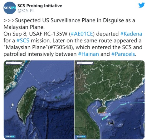 负责掌握南中国海动态和资讯的推特账户《南海战略态势感知计划》(SCS PI)发布推特帖文写道:“被质疑伪装成马来西亚客机的美军侦察机USAF RC-135W在2020年9月展开任务,随后在其飞行的同样路线中出现马来西亚客机编号750548,该飞机驶入南中国海,并在海南岛附近密集巡逻。”