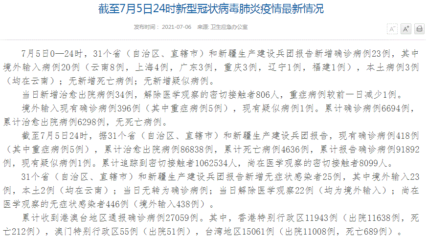 FX168财经报社(香港)讯 根据中国国家卫健委7月6日最新通报,7月5日0—24时,31个省(自治区、直辖市)和新疆生产建设兵团报告新增确诊病例23例,其中境外输入病例20例(云南8例,上海4例,广东3例,重庆3例,辽宁1例,福建1例),本土病例3例(均在云南);无新增死亡病例;无新增疑似病例。