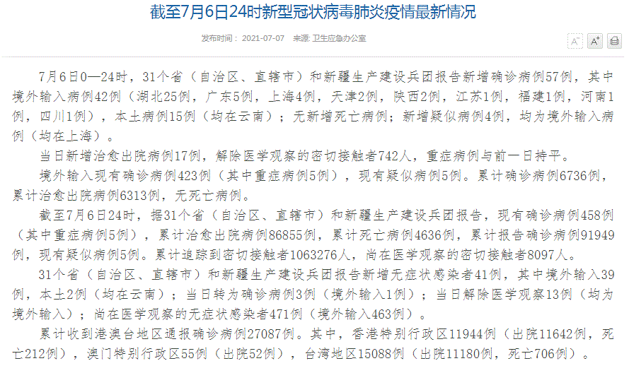 FX168财经报社(香港)讯 根据中国国家卫健委网站7月7日最新消息,7月6日0—24时,31个省(自治区、直辖市)和新疆生产建设兵团报告新增确诊病例57例,其中境外输入病例42例(湖北25例,广东5例,上海4例,天津2例,陕西2例,江苏1例,福建1例,河南1例,四川1例),本土病例15例(均在云南);无新增死亡病例;新增疑似病例4例,均为境外输入病例(均在上海)。