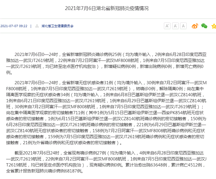 2021年7月6日0—24时,全省新增无症状感染者31例(均为境外输入,30例来自7月2日阿富汗—武汉MF8008航班,1例来自7月5日印度尼西亚雅加达—武汉JT2619航班),转确诊0例,解除隔离0例;尚在集中隔离医学观察的无症状感染者34例(均为境外输入,1例来自6月8日巴基斯坦伊斯兰堡—武汉CZ8140航班,1例来自6月21日印度尼西亚雅加达—武汉JT2619航班,1例来自6月29日巴基斯坦伊斯兰堡—武汉CZ8140航班,30例来自7月2日阿富汗—武汉MF8008航班,1例来自7月5日印度尼西亚雅加达—武汉JT2619航班);尚在集中隔离医学观察的密切接触者711例(其中1例为5月15日巴基斯坦伊斯兰堡—西安PK854航班无症状感染者的密切接触者,1例为6月15日巴基斯坦伊斯兰堡—武汉CZ8140航班确诊病例的密切接触者,150例为6月28日印度尼西亚雅加达—武汉JT2619航班确诊病例的密切接触者,221例为6月29日巴基斯坦伊斯兰堡—武汉CZ8140航班无症状感染者的密切接触者,158例为7月2日阿富汗—武汉MF8008航班确诊病例和无症状感染者的密切接触者,159例为7月5日印度尼西亚雅加达—武汉JT2619航班确诊病例和无症状感染者的密切接触者,21例为外省确诊病例和无症状感染者的密切接触者)。