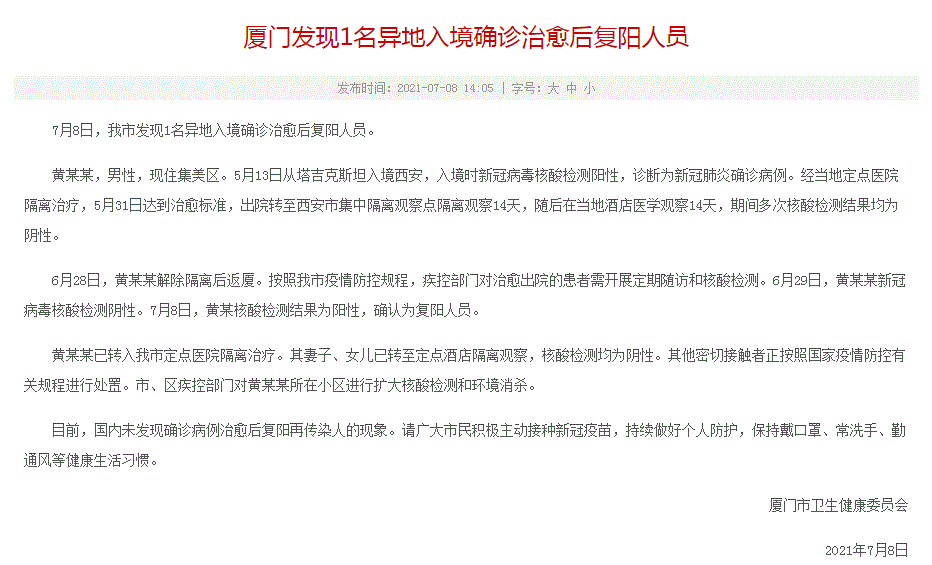 FX168财经报社(香港)讯 据厦门卫健委7月8日最新消息,7月8日,厦门市发现1名异地入境确诊治愈后复阳人员。