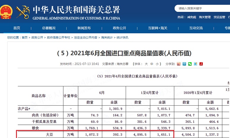 海关数据并显示,2021年前6个月,中国大豆进口量同比增长8.7%,达到4895.5万吨。