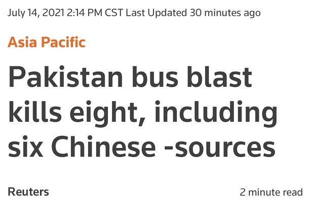 FX168财经报社(香港)讯 路透社周三(7月14日)最新报道称,多名消息人士告诉路透社,巴基斯坦北部偏远地区周三发生一起针对一辆巴士的爆炸,造成至少8人死亡,其中包括至少6名中国公民和1名巴基斯坦士兵。中方已发布紧急提醒,提醒在巴中国公民及企业密切关注当地安全形势,严密防范。