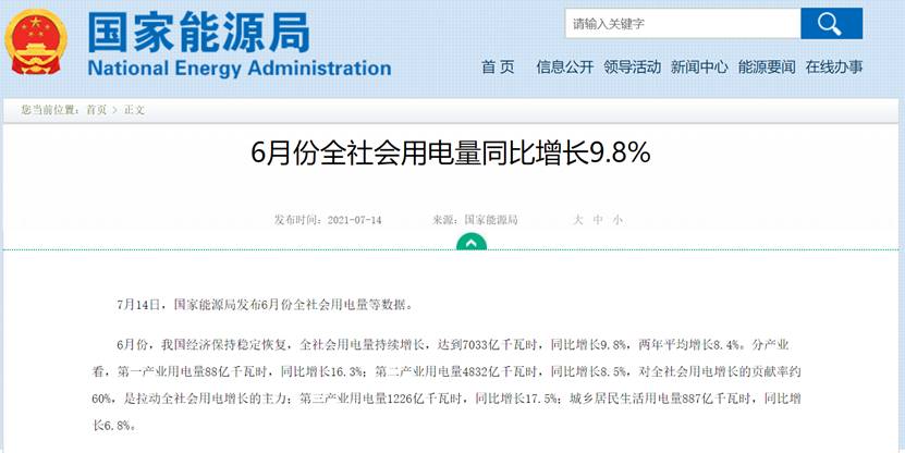 7月14日,国家能源局发布6月份全社会用电量等数据,显示6月份全社会用电量同比增长9.8%。