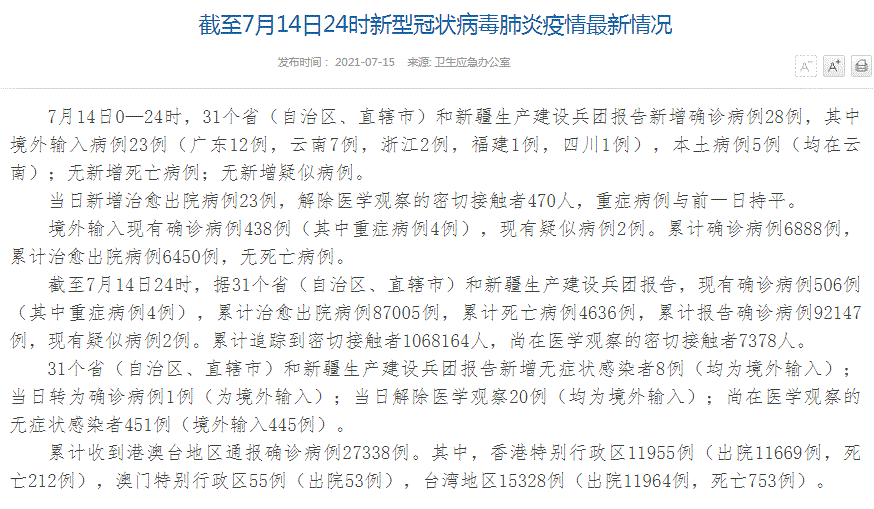 FX168财经报社(香港)讯 根据中国国家卫健委7月15日最新通报,7月14日0—24时,31个省(自治区、直辖市)和新疆生产建设兵团报告新增确诊病例28例,其中境外输入病例23例(广东12例,云南7例,浙江2例,福建1例,四川1例),本土病例5例(均在云南);无新增死亡病例;无新增疑似病例。
