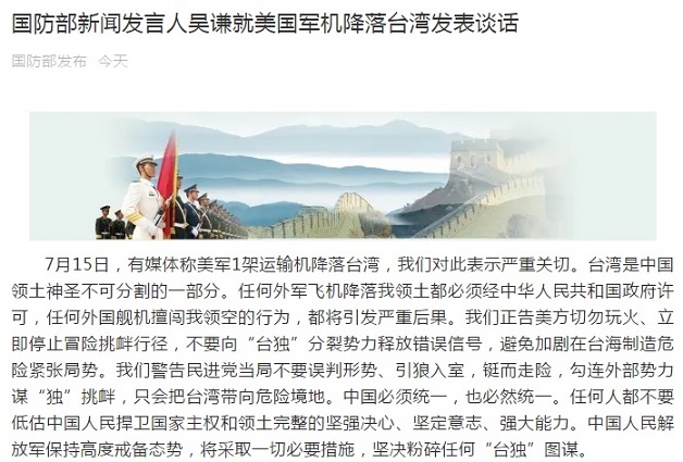 吴谦表示,7月15日,有媒体称美军1架运输机降落台湾,我们对此表示严重关切。台湾是中国领土神圣不可分割的一部分。任何外军飞机降落我领土都必须经中华人民共和国政府许可,任何外国舰机擅闯我领空的行为,都将引发严重后果。我们正告美方切勿玩火、立即停止冒险挑衅行径,不要向“台独”分裂势力释放错误信号,避免加剧在台海制造危险紧张局势。