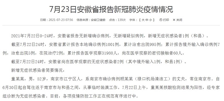 童某某,男,52岁,南京市江宁区人,系南京市确诊病例顾某某(禄口机场清洁工)的丈夫,常住南京市。自6月30日起自驾往返于南京市与和县之间,从事临时装潢工作。7月22日上午,童某某核酸检测结果为阳性,经专家组诊断为无症状感染者。目前,各项疫情防控工作正在规范有序进行中。