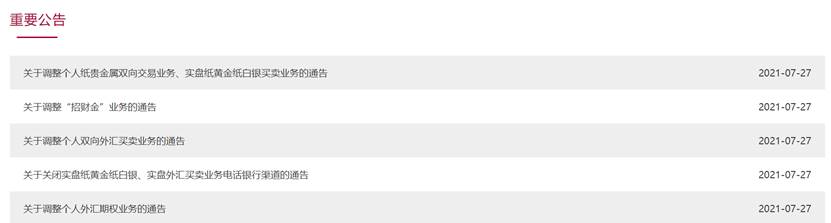 7月27日,招商银行接连发布五则通告,分别涉及关于调整个人外汇期权业务、个人双向外汇买卖业务、“招财金”业务以及个人纸贵金属双向交易业务、实盘纸黄金纸白银买卖业务的通告,并发布关闭实盘纸黄金纸白银、实盘外汇买卖业务电话银行渠道的通告。