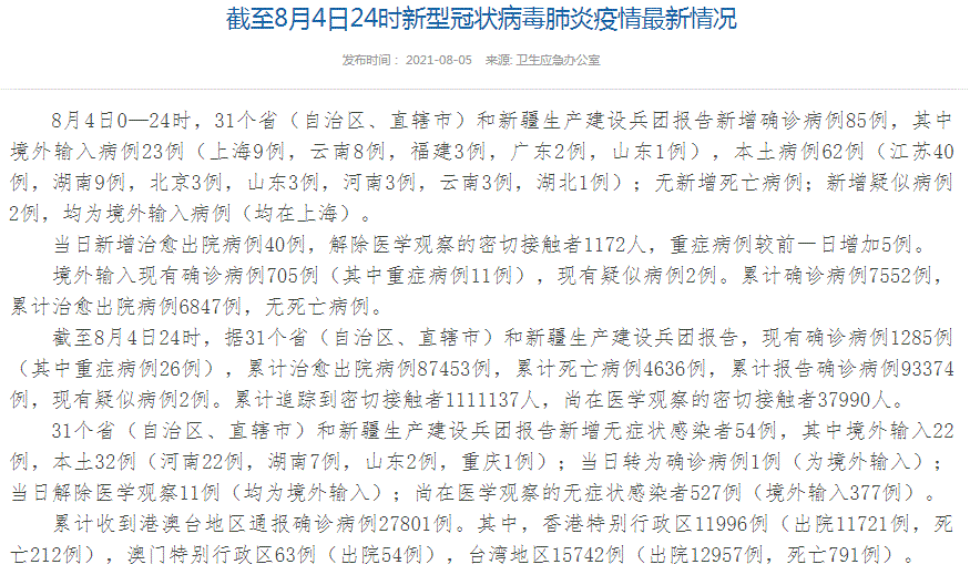FX168财经报社(香港)讯 根据中国国家卫健委8月5日最新通报,8月4日0—24时,31个省(自治区、直辖市)和新疆生产建设兵团报告新增确诊病例85例,其中境外输入病例23例(上海9例,云南8例,福建3例,广东2例,山东1例),本土病例62例(江苏40例,湖南9例,北京3例,山东3例,河南3例,云南3例,湖北1例);无新增死亡病例;新增疑似病例2例,均为境外输入病例(均在上海)。