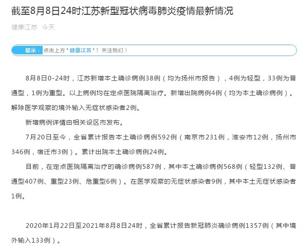 FX168财经报社(香港)讯 根据“健康江苏”8月9日最新消息,8月8日0-24时,江苏新增本土确诊病例38例(均为扬州市报告),4例为轻型,33例为普通型,1例为重型。以上病例均在定点医院隔离治疗。新增出院病例4例(均为本土确诊病例)。解除医学观察的境外输入无症状感染者2例。
