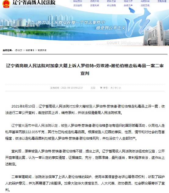 FX168财经报社(香港)讯 根据辽宁省高级人民法院周二(8月10日)最新消息,2021年8月10日,辽宁省高级人民法院对加拿大籍被告人罗伯特·劳埃德·谢伦伯格走私毒品上诉一案,依法进行二审公开宣判,裁定驳回上诉,维持原判,并依法报请最高人民法院核准。