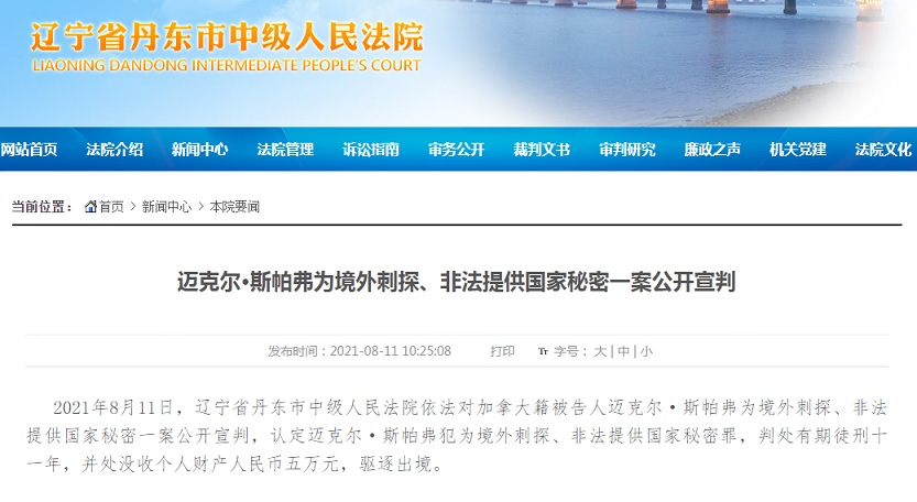 FX168财经报社(香港)讯 根据辽宁省丹东市中级人民法院周三(8月11日)最新消息,2021年8月11日,辽宁省丹东市中级人民法院依法对加拿大籍被告人迈克尔·斯帕弗为境外刺探、非法提供国家秘密一案公开宣判,认定迈克尔·斯帕弗犯为境外刺探、非法提供国家秘密罪,判处有期徒刑十一年,并处没收个人财产人民币五万元,驱逐出境。