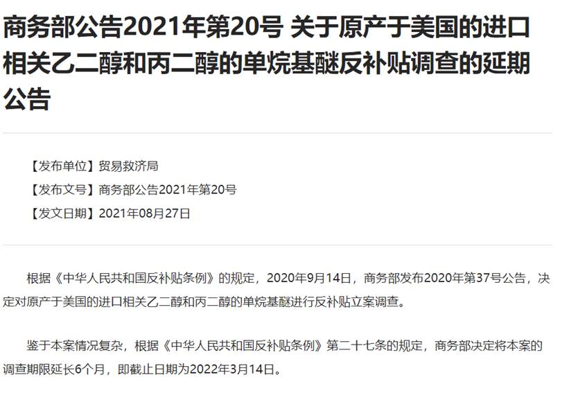 早在去年9月,中国商务部对原产于美国的进口相关乙二醇和丙二醇的单烷基醚发起反补贴立案调查。