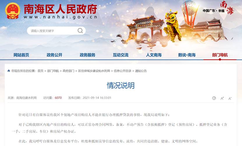 随后,佛山市南海区住房城乡建设和水利局9月14日发布《情况说明》,对“南海区个别地产项目购房人不能在银行办理抵押贷款”的消息进行辟谣。