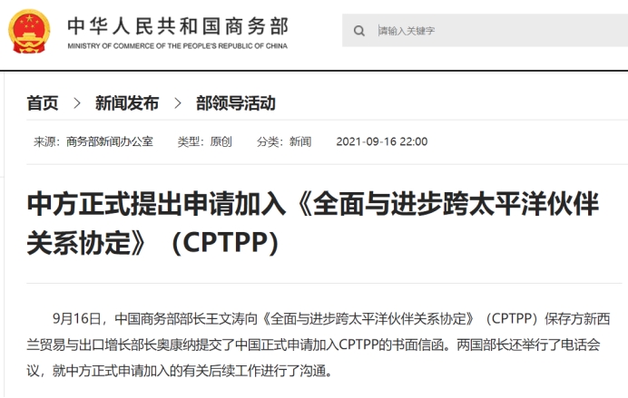9月16日,中国商务部新闻稿称,9月16日,中国商务部部长王文涛向《全面与进步跨太平洋伙伴关系协定》(CPTPP)保存方新西兰贸易与出口增长部长奥康纳提交了中国正式申请加入CPTPP的书面信函。