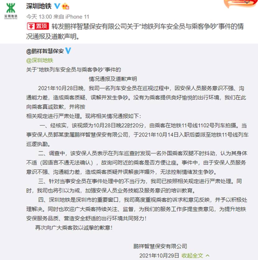 10月29日,鹏祥智慧保安有限公司微博@鹏祥智慧保安就“地铁列车安全员与乘客争吵”事件发布情况通报。