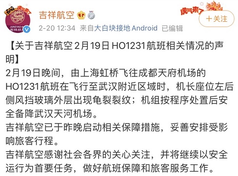 2月20日,吉祥航空发布通报称:2月19日晚间,由上海虹桥飞往成都天府机场的HO1231航班在飞行至武汉附近区域时,机长座位左后侧风挡玻璃外层出现龟裂裂纹;机组按程序处置后安全备降武汉天河机场。吉祥航空已于昨晚启动相关保障措施,妥善安排受影响旅客行程。吉祥航空感谢社会各界的关心关注,并将继续以安全运行为首要任务,做好航班保障和旅客服务工作。