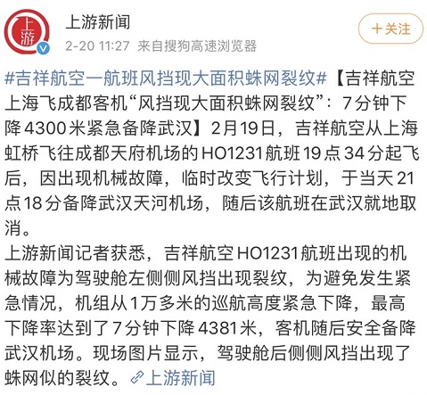 据“上游新闻”微博号,2月19日,吉祥航空从上海虹桥飞往成都天府机场的HO1231航班19点34分起飞后,因出现机械故障,临时改变飞行计划,于当天21点18分备降武汉天河机场,随后该航班在武汉就地取消。上游新闻记者获悉,吉祥航空HO1231航班出现的机械故障为驾驶舱左侧侧风挡出现裂纹,为避免发生紧急情况,机组从1万多米的巡航高度紧急下降,最高下降率达到了7分钟下降4381米,客机随后安全备降武汉机场。现场图片显示,驾驶舱后侧侧风挡出现了蛛网似的裂纹。