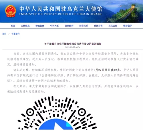 FX168财经报社(北美)讯 周四(2月24日),中国驻乌克兰大使馆发文称,乌克兰国内局势急剧恶化,为准备分批包机接返事宜,现开始人员登记,包机派出时间根据飞行安全情况确定。