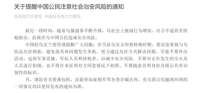 2月26日,中国驻乌克兰使馆发布最新公告称:最近一段时间,随着乌俄战事不断升级,乌社会上极端行为增加,出言不逊甚至持枪射击,给我在乌中国公民造成安全风险。