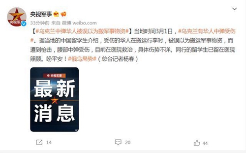 据央视军事微博消息,据当地的中国留学生介绍,受伤的华人在搬运行李时,被误以为搬运军事物资,而遭到枪击,腰部中弹受伤,目前在医院救治,具体伤势不详。同行的留学生已留在医院照顾。