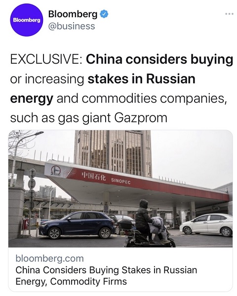 据彭博社最新报道,上述知情人士说,北京方面正在与中国石油天然气集团公司(China National Petroleum Corp.)、中国石化集团公司(China Petrochemical Corp.)、中国铝业集团公司(Aluminum Corp. of China)和中国五矿集团公司(China Minmetals Corp.)等国有企业就任何可能投资俄罗斯公司或资产的机会进行谈判。